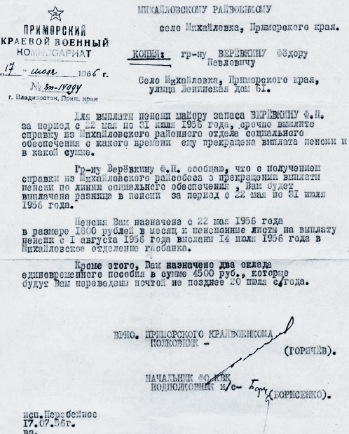 В январе 1957 года папе через военкомат дали во Владивостоке двухкомнатную квартиру, и родители с Алешей перебрались из Михайловки во Владивосток. Я в эту квартиру въехал раньше всех из студенческого общежития. В Михайловку папе пришли долгожданные документы о его полной реабилитации. Его восстановили в воинском звании майора с последующим увольнением в отставку, выплатили какую-то сумму, из которой папа мне сразу выделил на велосипед за мои настойчивые действия по его реабилитации.