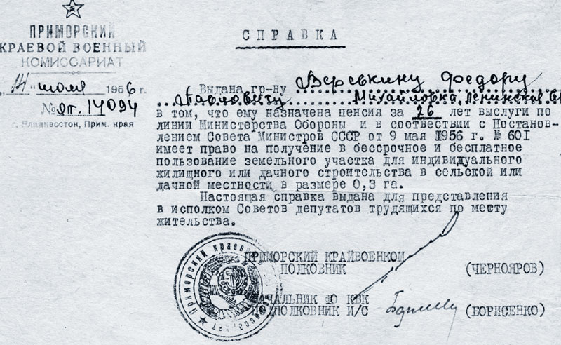 Кроме назначения военной пенсии, папа получил очень важную бумагу, ценность которой мы тогда не оценили. Папе выделялось безвозмездно на все времена 30 соток земли в пригороде Владивостока. Когда на семейном совете решалось, что делать с той землей, то я первый стал возражать против того, чтобы землю взять. Папа и мама тогда работать на земле в полную силу уже не могли. Зоя с мужем (Володину воинскую часть перевели в Хабаровск) были не в счет, Борис был в Ленинграде, Лена после сельхозинститута уехала по распределению в Бурятию. Оставался один работник — я. А у меня тогда никакой тяги к земле не было. В свободное от учебы время я увлекался многими вещами, но только не сельхозработами. Время показало, что я был сто раз неправ. Цены на землю в пригородах Владивостока возросли многократно. Теперь мой участок, условно называемый дачей, так как на нем нет пока приличного домика, находится в 50 км от городской квартиры. А мог бы быть почти рядом…