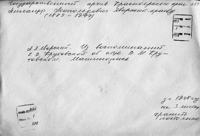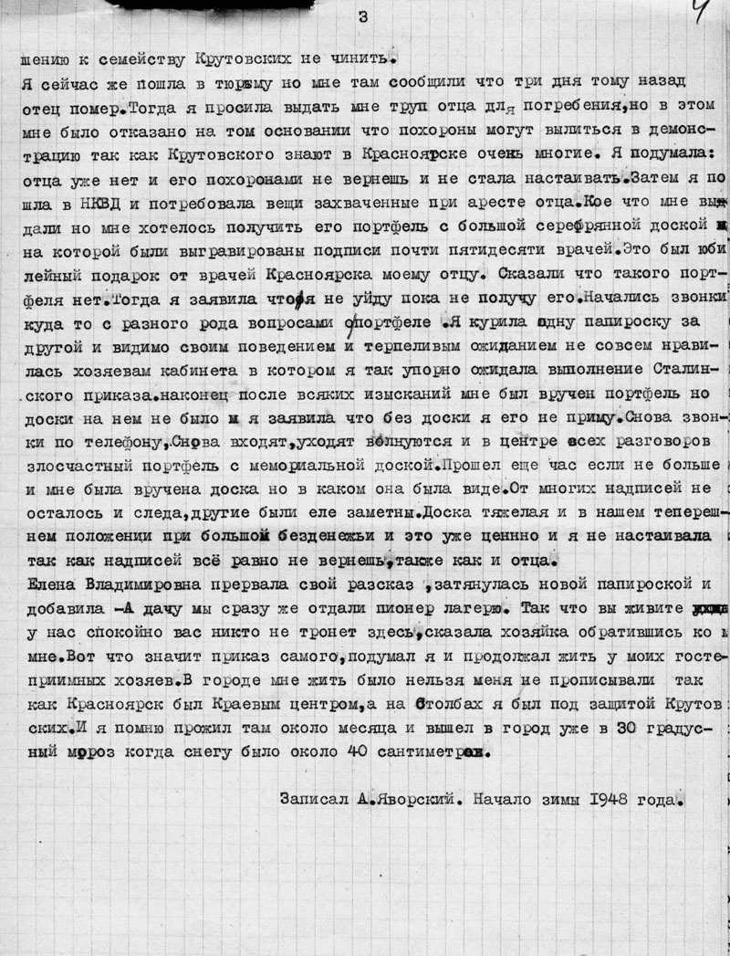 Я сейчас же пошла в тюрьму но мне там сообщили что три дня тому назад отец помер. Тогда я просила выдать мне труп отца для погребения, но в этом мне было отказано на том основании что похороны могут вылиться в демонстрацию так как Крутовского знают в Красноярске очень многие. Я подумала: отца уже нет и его похоронами не вернешь и не стала настаивать. Затем я пошла в НКВД и потребовала вещи захваченные при аресте отца. Кое что мне выдали но мне хотелось получить его портфель с большой серебряной доской на которой были выгравированы подписи почти пятидесяти врачей. Это был юбилейный подарок от врачей Красноярска моему отцу. Сказали что такого портфеля нет. Тогда я заявила что я не уйду пока не получу его. Начались звонки куда то с разного рода вопросами о портфеле. Я курила одну папироску за другой и видимо своим поведением и терпеливым ожиданием не совсем нравилась хозяевам кабинета в котором я так упорно ожидала выполнение Сталинского приказа. Наконец после всяких изысканий мне был вручен портфель но доски на нем не было и я заявила что без доски я его не приму. Снова звонки по телефону. Снова входят, уходят волнуются и в центре всех разговоров злосчастный портфель с мемориальной доской. Прошел еще час если не больше и мне была вручена доска но в каком она была виде. От многих надписей не осталось и следа, другие были еле заметны. Доска тяжелая и в нашем теперешнем положении при большом безденежьи и это уже ценно и я не настаивала так как надписей всё равно не вернешь, также как и отца.