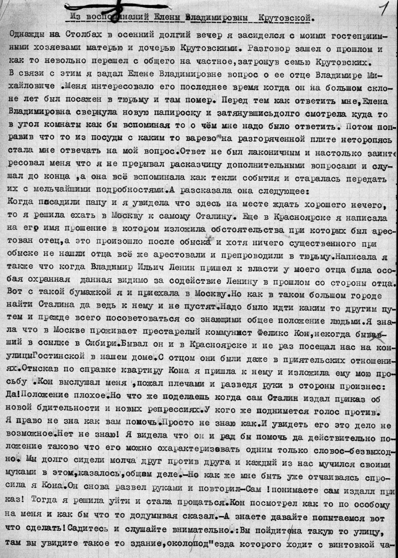 Однажды на Столбах в осенний долгий вечер я засиделся с моими гостеприимными хозяевами матерью и дочерью Крутовскими. Разговор зашел о прошлом и как то невольно перешел с общего на частное, затронув семью Крутовских. В связи с этим я задал Елене Владимировне вопрос о ее отце Владимире Михайловиче. Меня интересовало его последнее время когда он на большом склоне лет был посажен в тюрьму и там помер. Перед тем как ответить мне, Елена Владимировна свернула новую папироску и затянувшись, долго смотрела куда то в угол комнаты как бы вспоминая то о чём мне надо было ответить. Потом поправив что то из посуды с каким то варевом на разгоряченной плите не торопясь стала мне отвечать на мой вопрос. Ответ не был лаконичным и настолько заинтересовал меня что я не прерывал рассказчицу дополнительными вопросами и слушал до конца, а она всё вспоминала как текли события и старалась передать их с мельчайшими подробностями. А разсказала она следующее: Когда посадили палу и я увидела что здесь на месте ждать хорошего нечего, то я решила ехать в Москву к самому Сталину. Еще в Красноярске я написала на его имя прошение в котором изложила обстоятельства при которых был арестован отец, а это произошло после обыска и хотя ничего существенного при обыске не нашли отца всё же арестовали и препроводили в тюрьму. Написала я также что когда Владимир Ильич Ленин пришел к власти у моего отца была особая охранная данная видимо за содействие Ленину в прошлом со стороны отца. Вот с такой бумажкой я и приехала в Москву. Но как в таком большом городе найти Сталина да ведь к нему и не пустят. Надо было идти каким то другим путем и прежде всего посоветоваться со знающими общее положение людьми. Я знала что в Москве проживает престарелый коммунист Феликс Кон, некогда бывавший в ссылке в Сибири. Бывал он и в Красноярске и не раз посещал нас на конце улицы Гостинской в нашем доме. С отцом они были даже в приятельских отношениях. Отыскав по справке квартиру Кона я пришла к нему и изложила ему мою просьбу. Кон выслушал меня, пожал плечами и разведя руки в стороны произнес: Да! Положение плохое. Но что же поделаешь когда сам Сталин издал приказ об новой бдительности и новых репрессиях. У кого же поднимется голос против. Я право не знаю как вам помочь. Просто не знаю как. И увидеть его это дело не возможное. Нет не знаю! Я видела что он и рад бы помочь да действительно положение таково что его можно охарактеризовать одним только словом – безвыходно. Мы долго сидели молча друг против друга и каждый из нас мучился своими муками в этом, казалось, общем деле. Но как же мне быть уже отчаиваясь спросила я Кона. Он снова развел руками и повторил - Сам! понимаете сам издал приказ! Тогда я решила уйти и стала прощаться. Кон посмотрел как то по особому на меня и как бы что то додумывая сказал. - А знаете давайте попытаемся вот что сделать! Садитесь и слушайте внимательно: Вы пойдите на такую то улицу, там вы увидите такое то здание, около подъезда которого ходит с винтовкой часовой. Вот вы прямо идите на него. Когда вы подойдете совсем близко он повернется к вам и возьмет винтовку на перевес как бы загораживая вам ход штыком. Вы не бойтесь, отстраните винтовку, ладонью отведя штык в сторону и проходите в двери а там увидите в вестибюле много окошечек в которых находятся секретари Сталина и если вам уда