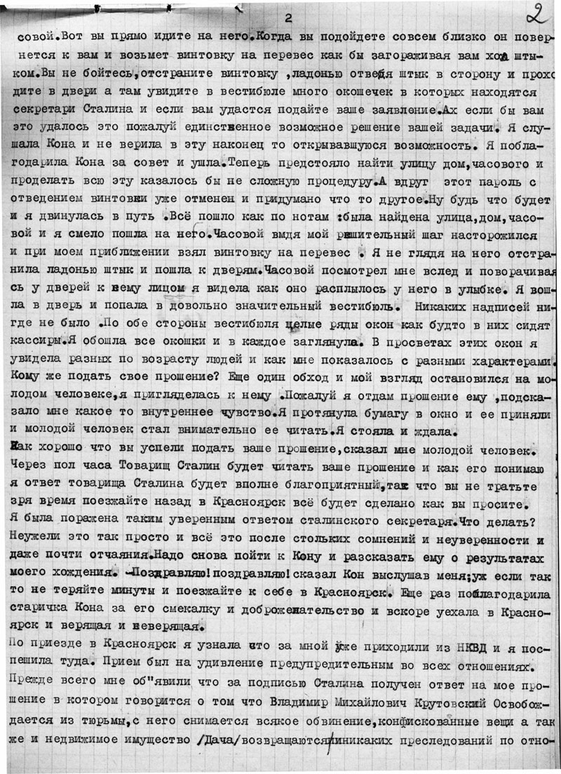 По приезде в Красноярск я узнала что за мной уже приходили из НКВД и я поспешила туда. Прием был на удивление предупредительным во всех отношениях. Прежде всего мне объявили что за подписью Сталина получен ответ на мое прошение в котором говорится о том что Владимир Михайлович Крутовский освобождается из тюрьмы, с него снимается всякое обвинение, конфискованные вещи а так же и недвижимое имущество /Дача/ возвращаются и никаких преследований по отношению к семейству Крутовских не чинить.