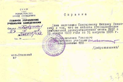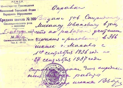 Находясь в Харбине, Михаил Иванович поступил работать по предложению учебного отдела КВЖД и советского консульства преподавателем графических искусств в школу для детей граждан Советского Союза, работавших на КВЖД. Днём он работал в школе, а вечерами играл в джаз-оркестре на сценах ресторанов, т.к. заработок в оркестре был гораздо выше, чем в школе, а у молодой семьи потребности и расходы возросли. К тому же необходим был капитал на приобретение жилья в Советском Союзе. В 1929 году во время военного конфликта на КВЖД Михаил Иванович Спиридонов был арестован китайской полицией и содержался три месяца в концентрационном лагере. После ареста следствия по делу не велось и обвинения никакого не предъявлялось. Из концентрационного лагеря он был освобождён после окончания конфликта на КВЖД по требованию приехавшего в Харбин советского Консула. Голодные годы начала 30-х годов прошлого столетия, спровоцированные насильственной коллективизацией в Советском Союзе, как сатанинским бульдозером прошлись по семье Спиридоновых: в 1930 году скончалась от туберкулёза единственная сестра Михаила Ивановича, а спустя год – мать Мария Ивановна. В 1932 году Михаил Иванович с женой возвращается на жительство в Москву, где по всей вероятности он приобрёл квартиру. С его слов известно, что в Барнауле он больше не бывал и о смерти сестры Валентины узнал от Виктора. Первые сведения о службе М.И.Спиридонова в госучреждениях относятся к началу 1933-го года: с января 1933-го по август 1936-го года он работал преподавателем черчения в Центральной эксплуатационной школе НКПС (Наркомат Путей Сообщения), а с 1-го сентября 1936-го по 27-е сентября 1937-го года – учителем черчения и рисования в средней школе № 366 Сокольнического района Москвы.