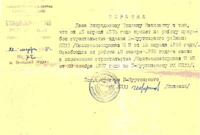 В январе 1952-го года он переходит на работу в райкомунхоз прорабом. А по вечерам в клубе руководит эстрадным и струнным оркестрами. В мае этого же года Михаил Иванович, В.А.Степун и А.П.Георгиева (тоже ссыльные) получают разрешение поссовета на строительство собственного дома на ул. Новой (ныне ул. Интернациональная), покупают в складчину старый сруб в дер. Новоникольское, перевозят его в Мурту, и уже в августе переселяются в свой дом (ул. Интернациональная 103). Так они решили проблему собственного угла.