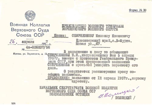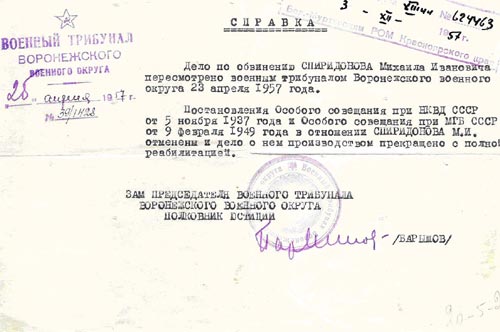 В архивном уголовном деле № Р12543 обнаружено письмо М.И.Спиридонова в Генеральную Прокуратуру СССР, в котором пишет, что он 11 раз обращался с просьбой о пересмотре его дела, но все письма остались без ответа. Спрашивается, где предыдущие 10 писем? Ответ прост: их перехватывала лагерная комендатура НКВД-НКГБ.