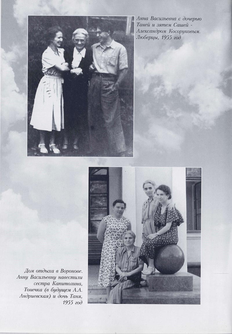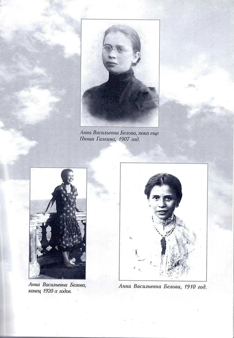 Много переживаний, радостных и горьких, ожидало Анну в 1909 году. Она вышла замуж за инженера Алексея Григорьевича Белова. Жила с ним и его родней недалеко от Люберец, в Вишняках, в маленьком домике. Семья Галкиных, особенно Василий Никитич, ее замужества не одобряли, а родившийся в 1910 году сынишка вскоре скончался. Спустя некоторое время брак был расторгнут. О жизни в маленьком домике в Вишняках мама рассказывала очень мало. Помню только, как, смеясь, она вспоминала свой «политический ликбез». В этом домике снимал комнату студент Московского университета. Держался очень скромно и осторожно. Судя по всему, был членом революционной организации. Молодой женщине беседовать с ним было интересно, особенно на социальные темы.