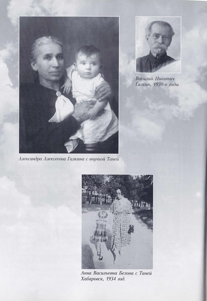 Моя мама Анна Васильевна Белова (в девичестве Галкина) родилась 14 декабря 1892 года в предместье Владимира Ундоле. Ее отец Василий Никитич Галкин (1858-1940) – по происхождению крестьянин Владимирской губернии и уезда, Махалковской волости, села Палашкино, а дед – Никита Галкин – был богомазом. Из документов в семейном архиве известно, что отец с 1881 но 1886 год служил в 97-м пехотном Лифляндском полку в городе Динабурге, в том числе год был на сверхсрочной службе, произведен в отделенные начальники, а затем в фельдфебели. После службы и армии он приехал во Владимир, где вскоре женился и где появилась на свет его первая дочь – моя мама. В 1895 году начал служить на Московско-Казанской железной дороге в Люберцах в службе сборов, где проработал до 1930 года. Жил в небольшом собственном доме напротив станции. Для строительства этого дома он получил от железнодорожной компании небольшой земельный участок и кредит. Деревянная пятистенка с последующей пристройкой простояла лет девяносто.