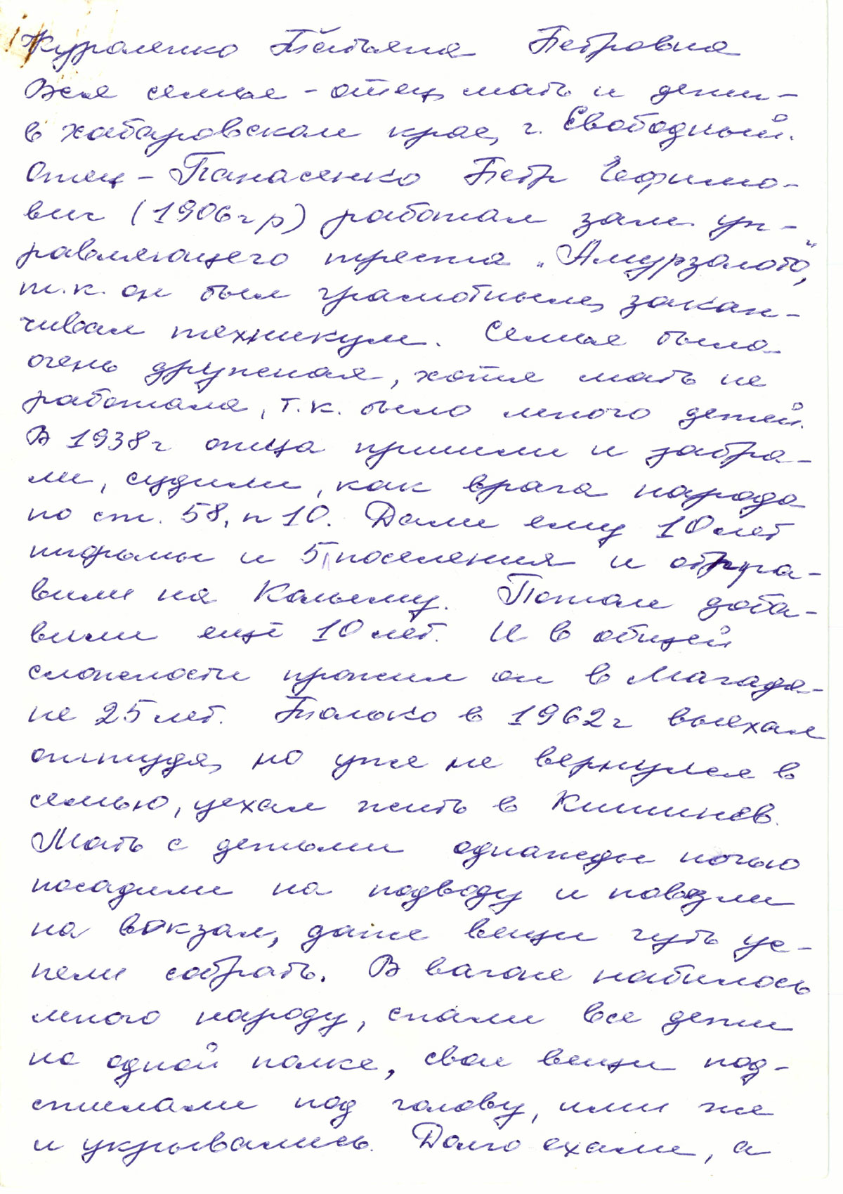 В 1938 отца пришли и забрали, судили как врага народа по ст. 58, п. 10. Дали ему 10 лет тюрьмы и 5 лет поселения, и отправили на Колыму. Потом добавили еще 10 лет. И в общей сложности прожил он в Магадане 25 лет. Только в 1962 выехал оттуда, но уже не вернулся в семью, уехал жить в Кишинев.