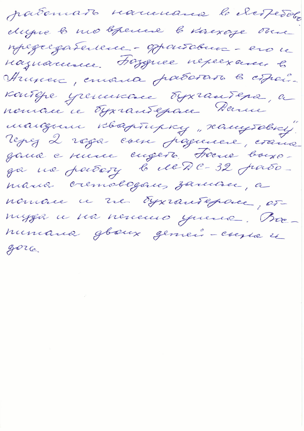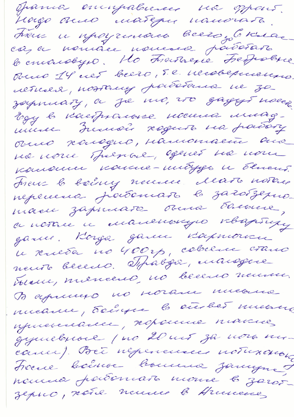 Мать потом перешла работать в Заготзерно. Там зарплата была больше, а потом и маленькую квартиру дали. Когда дали карточки и хлеба по 400 гр, совсем стало жить весело. Правда, молодые были, тяжело, но весело жили. В армию по ночам письма писали, бойцы в ответ письма присылали, хорошие такие, душевные (по 20 шт за ночь писали). Все пережили потихоньку. После войны вышла замуж, пошла работать тоже в заготзерно, хотя жили в Ачинске, работать начинала в Ястребово. Муж в то время в колхозе был председателем - фронтовик - его и назначили. Позднее переехали в Ачинск, стала работать в стройконторе учеником бухгалтера, а потом и бухгалтером. Дали молодым квартирку “хомутовку”. Через два года сын родился, стала дома с ним сидеть. После выхода на работу в МДС-32 работала счетоводом, замом, а потом и главным бухгалтером, оттуда и на пенсию ушла. Воспитала двоих детей - сына и дочь.