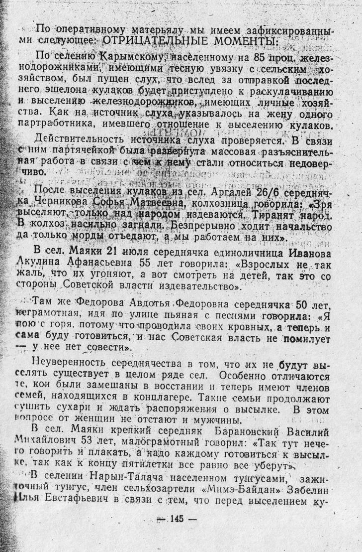 "Жили родители в селе Кубухай Оловянинского района, где и были раскулачены в 1928 или 1929 году. Затем они переехали в с. Маковеево Читинского района, откуда и были выселены в 1931 году в Красноярский край. Сначала жили в п. Мурожный бывшего Удерейского района, затем в пос. Татарка. Я сначала работала рабочей, затем училась в педучилище в Енисейске. Отец умер в 1934 году. Мама с младшей сестрой перебралась ко мне".