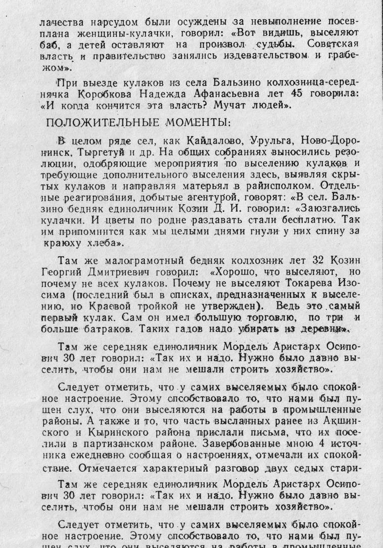 "Наша семья была выселена как кулаки в Красноярский край, село Татарка. В селе Джида остался наш дом, а скот забрали в коммуну. В 1933 году отца арестовали, через несколько месяцев его отпустили, в скором времени он умер".