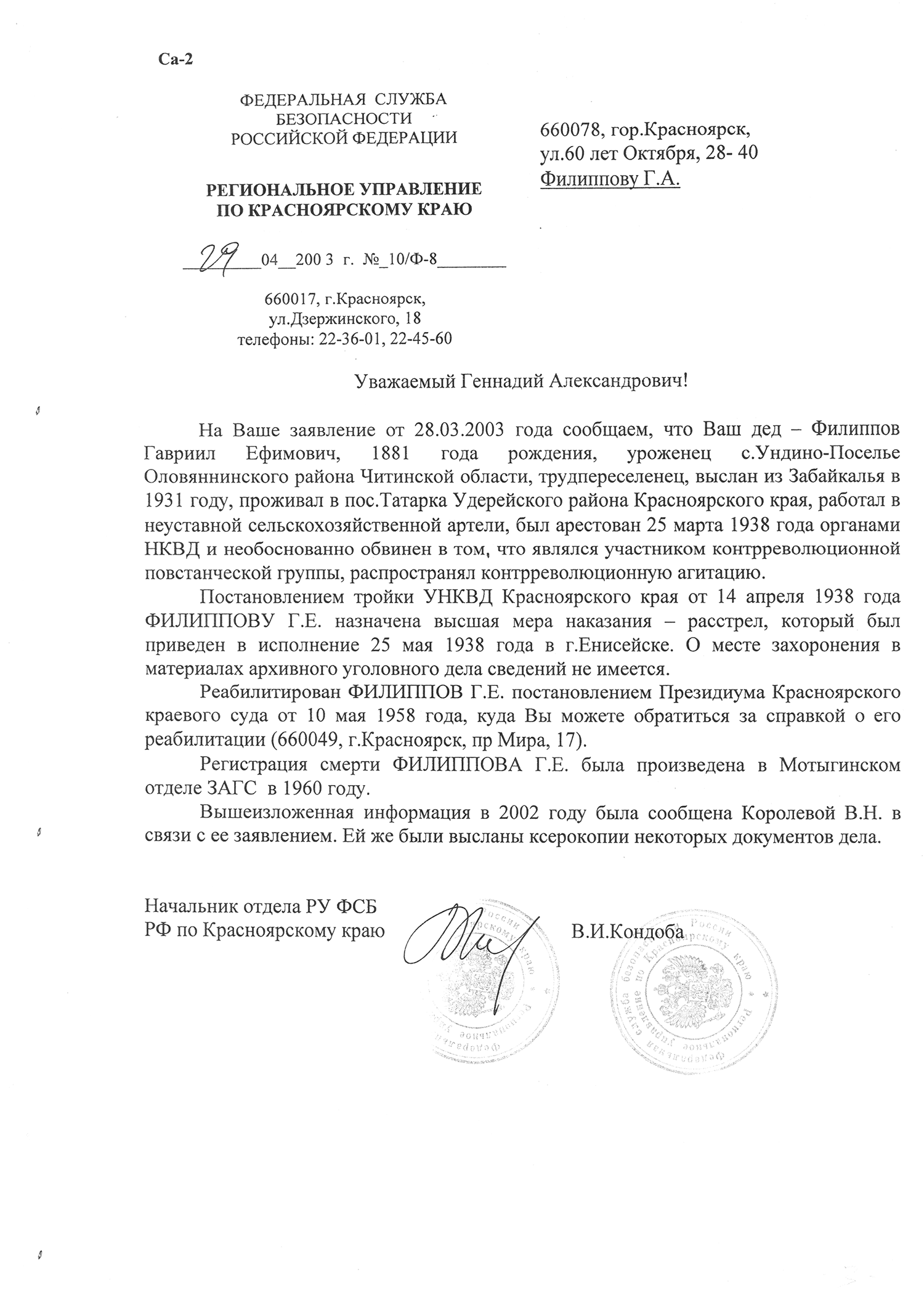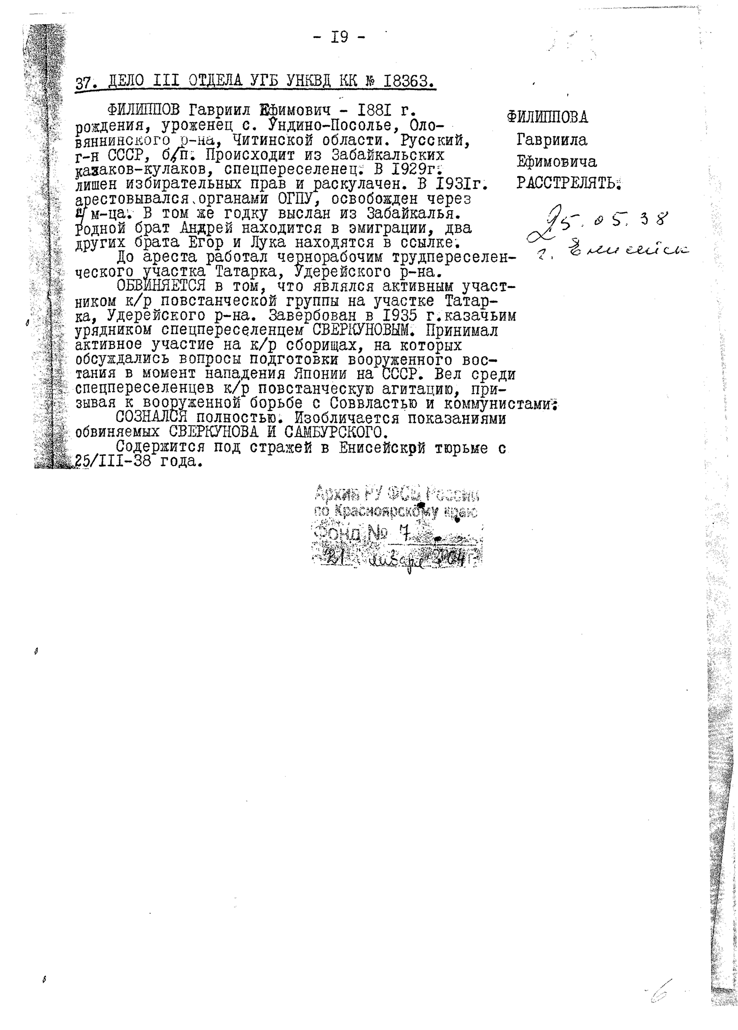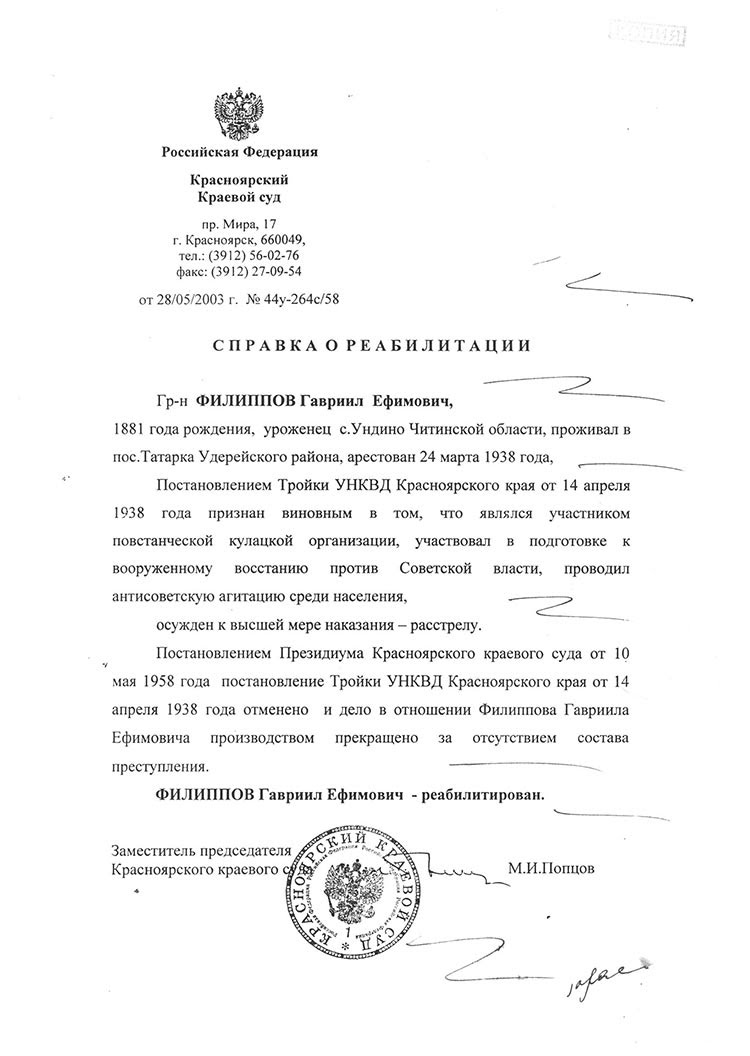 15.05.1938г. Реабилитирован 10.05.1958. Красноярским крайсудом.