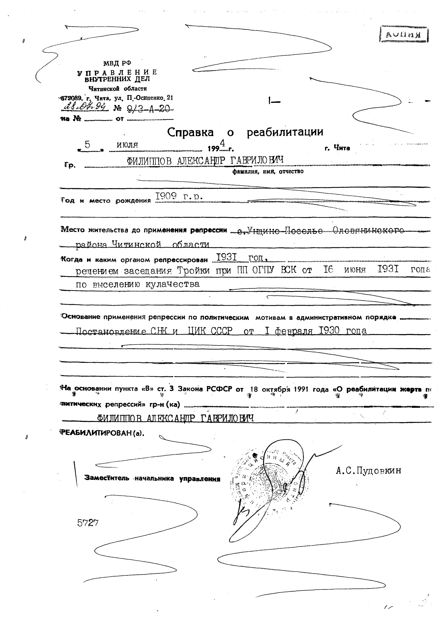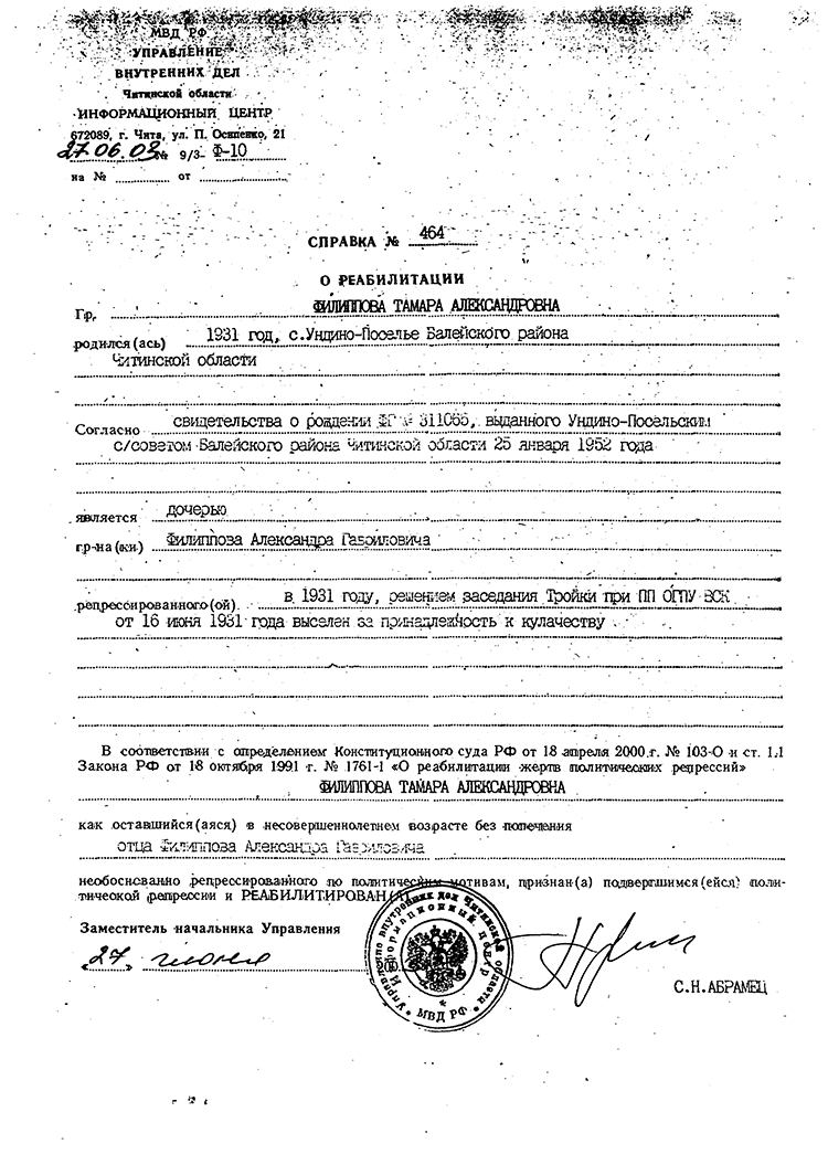 ФИЛИППОВ Гавриил Ефимович 1883 г.р. -- в 1931 году выселен из села Ундино-Поселье Оловянинского района вместе с семьей в Красноярский край Енисейский район пос. Стрелка, жена Анна Михайловна 1883 г.р., дети Александр 1909 г.р., Анна 1911 г.р., Вера 1928 г.р., Мария 1931 г.р.