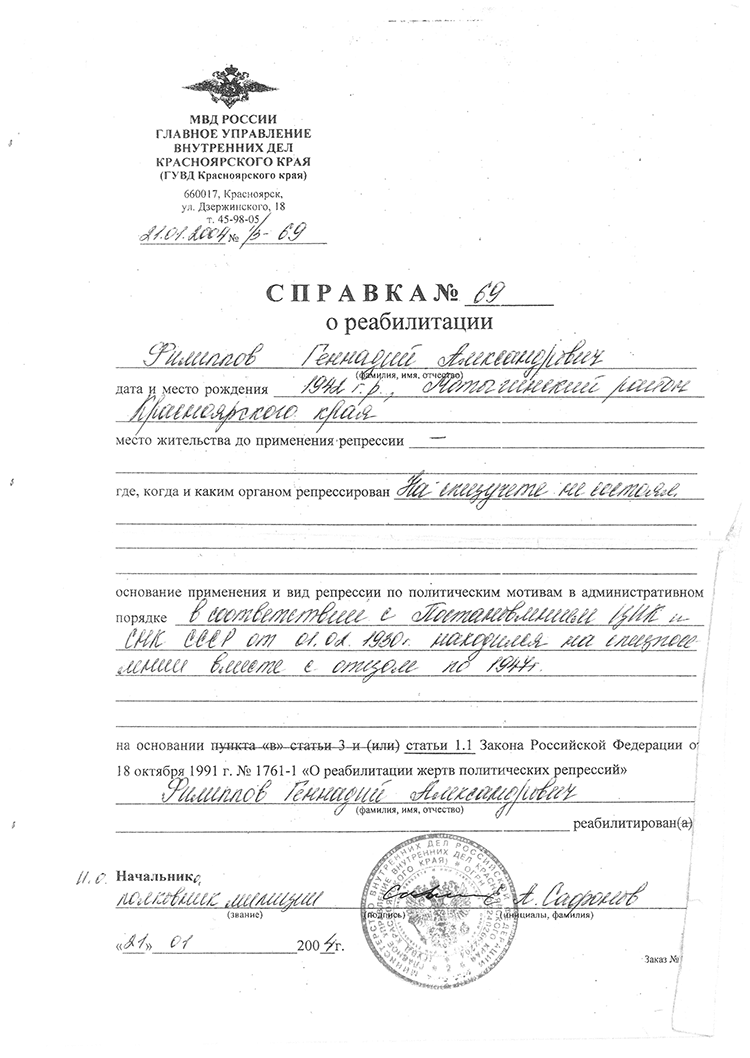 Когда я стала хлопотать реабилитацию, то в Енисейске не оказалось никаких документов и даже в Красноярске. Воистину тайные лагеря смерти. Но ведь было много ссыльных, и после великих потерь людей еще оставалось много. Жили они в Нижнем Приангарье и по берегам Енисея до Казачинска. Было поселение Рычково, Степановка, Белокопытовка. Сейчас этих поселений нет. В Татарке сейчас живут староверы.