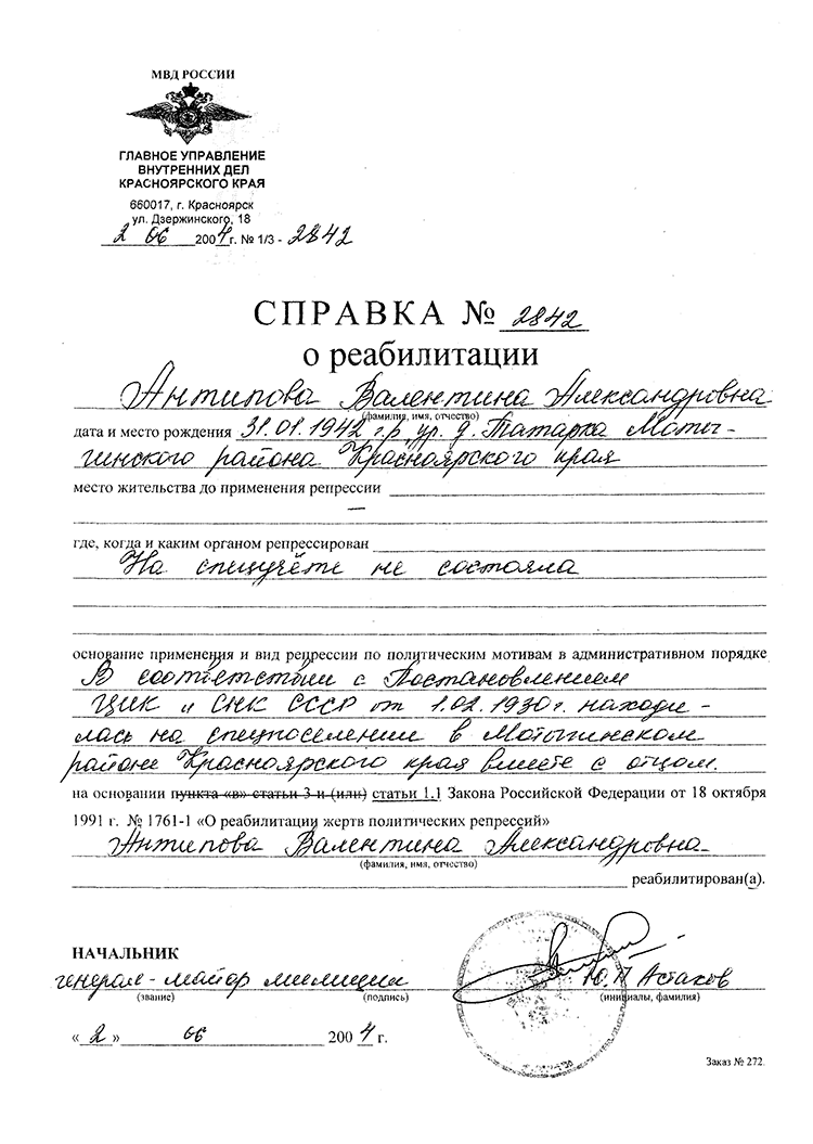 "Маму Татьяну Алексеевну и отца Никандра Михайловича арестовали, а нас на телеге вывезли в Нер- Завод. Там нас соединили с мамой. Потом ехали в телячьих вагонах, затем -- на плотах по Ангаре до Мотыгино. Недели две жили в церкви, затем угнали на Гребешок -- открывать колхоз. Через два года к нам приехал отец, а в 1938 году его опять арестовали. Нас с мамой увезли в колхоз деревни Татарка на Ангаре. Отца расстреляли. Вся моя семья похоронена в д. Подтесово. Меня в 1941 году мобилизовали в трудармию, направили на Норильскую стройку. С учета комендатуры сняли в 1945 году, получила паспорт. В деревне Подтесово жила и работала до пенсии. Столько страданий и невзгод пришлось пережить за эти годы, даже вспоминать невозможно"