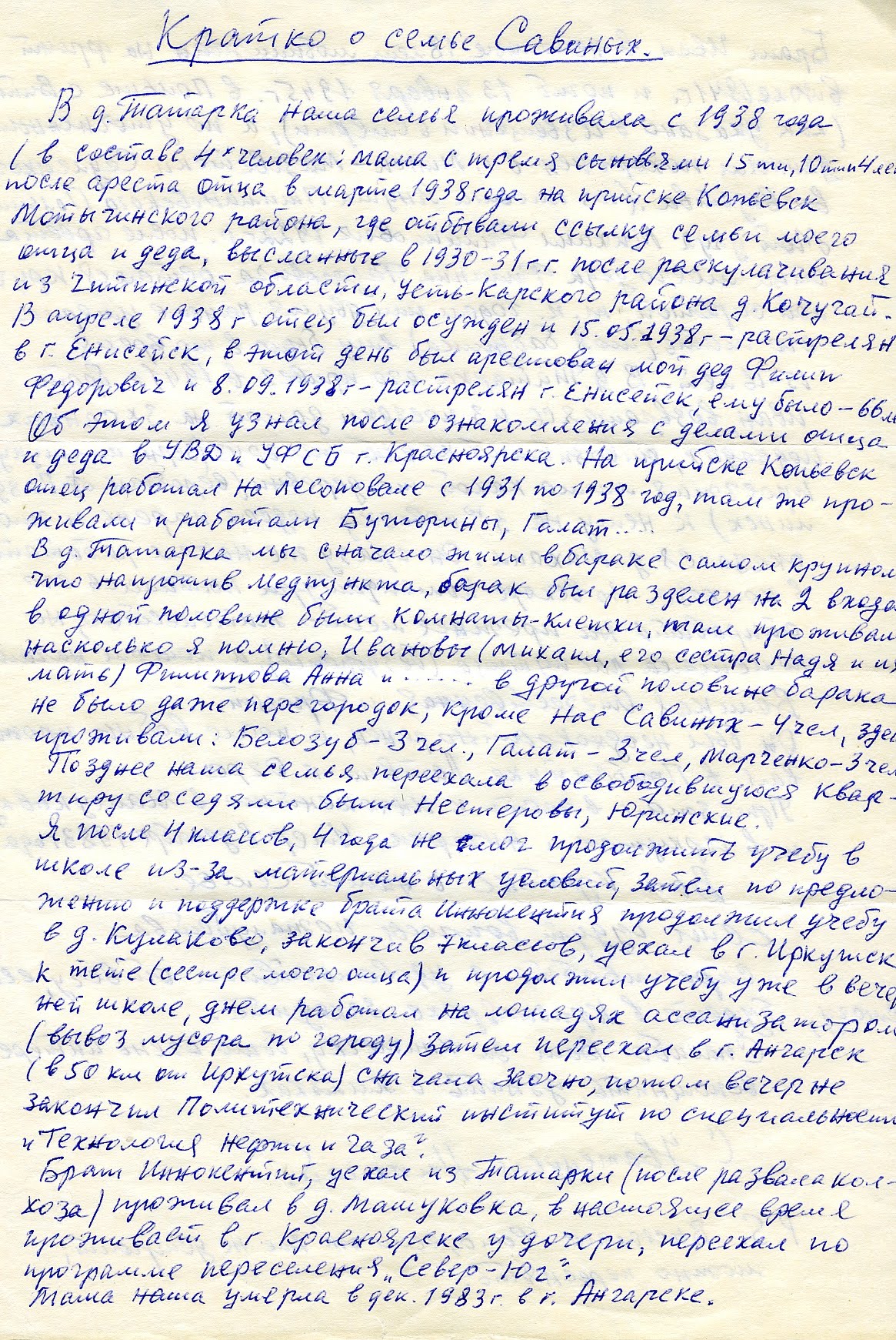 "Находились в ссылке под комендатурой с 1931 по 1947-48 гг. Отец Арсений Митрофанович работал на сплаве леса и умер в 1933 году в Енисейске. Мы работали в колхозе "Труженик" д. Татарка. Мать умерла в 1947 году. Мне учиться не пришлось, так и осталось мое образование на трех классах".
