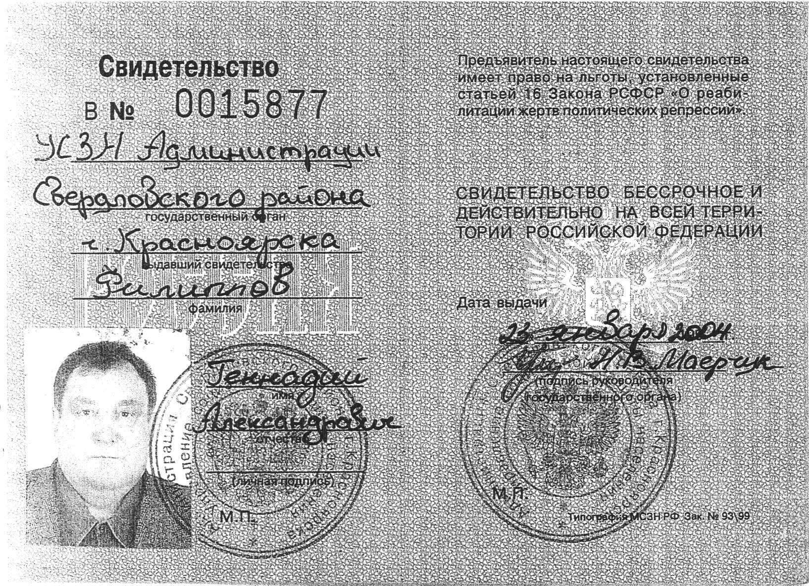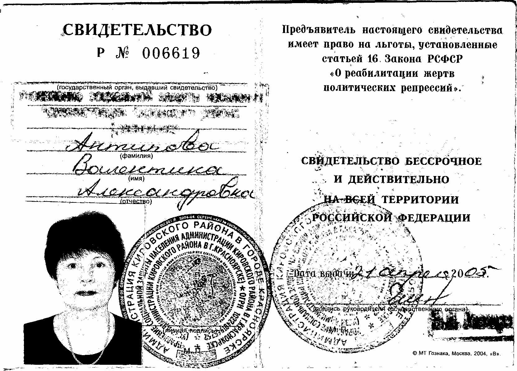 Свидетельство о реабилитации Филипповой Валентины Александровны