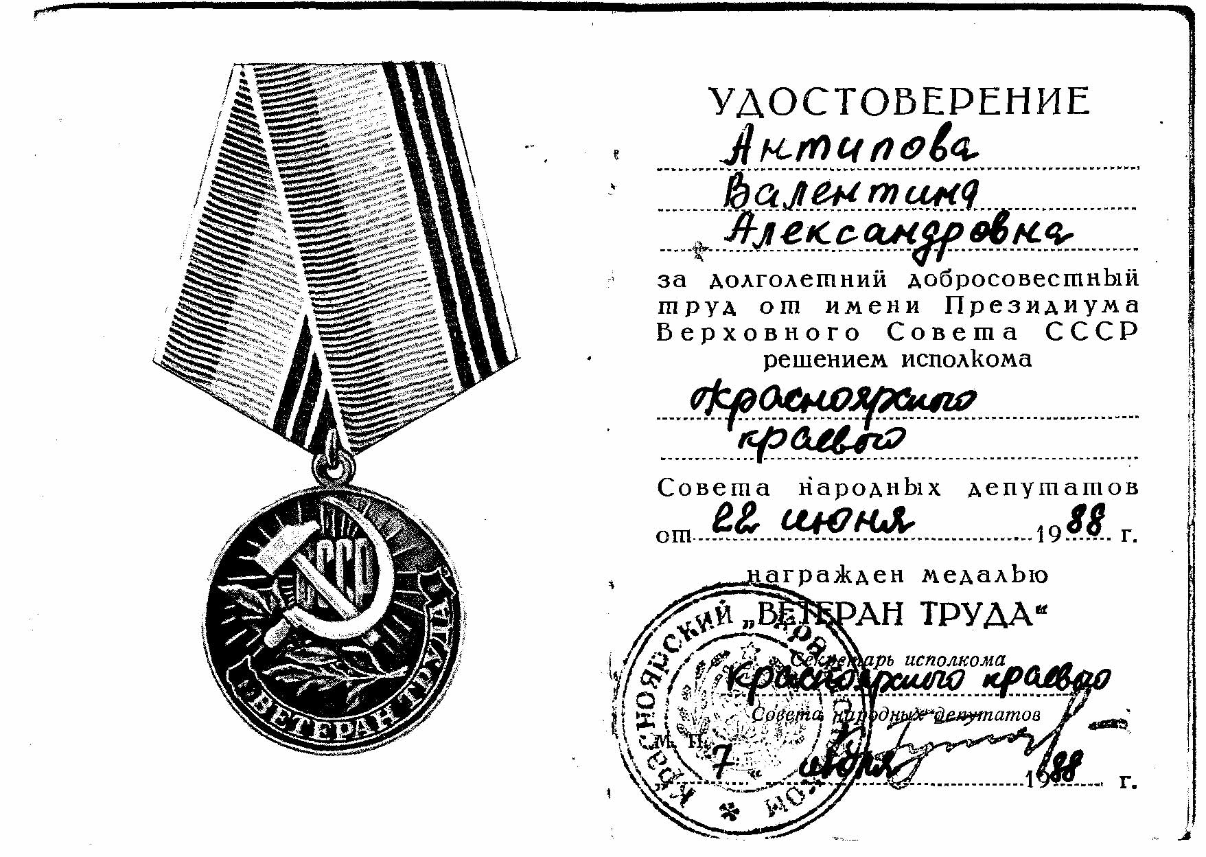 удостоверение о награждении медалью "За доблестный и самоотверженный труд в годы