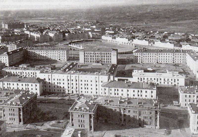 Тогда я уже работал каменщиком. Это была левая сторона проспекта Сталина, на правую сторону мы переходили по воздушному мосту. Мост был построен из столбов на высоте 3 - 4 м от земли, типа арки, полностью был окутан колючей проволокой. На правой стороне находился мехцех Горстроя, где сейчас находится «Норильскпроект», управление комбината. Далее, на улице Пушкина, строили школу № 4, где сейчас находится стадион «Заполярник». Ранее там был совхоз и небольшое озеро, весь грунт стадиона «Заполярник» был насыпан при помощи ручной тачки. Грунт добывался из котлованов и перевозился заключенными. Это со стороны школы №4. С противоположной стороны был установлен ленточный транспортер, по которому велась отсыпка стадиона грунтом также из котлованов строящихся будущих домов и сангородка...