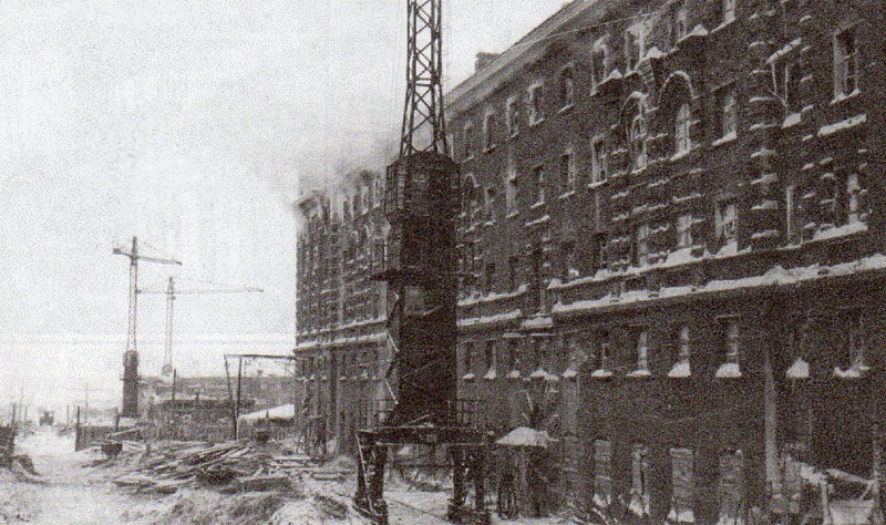 Строительство дома N1 16 на Ленинском проспекте при помощи башенных кранов. 1953