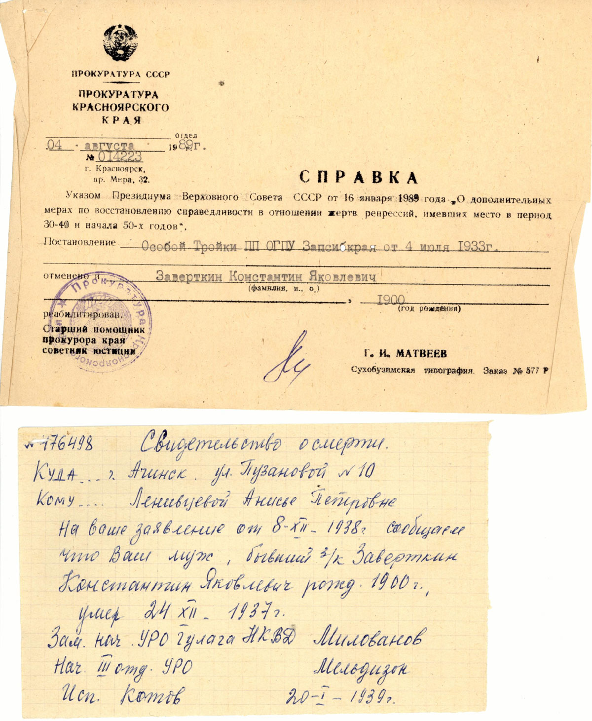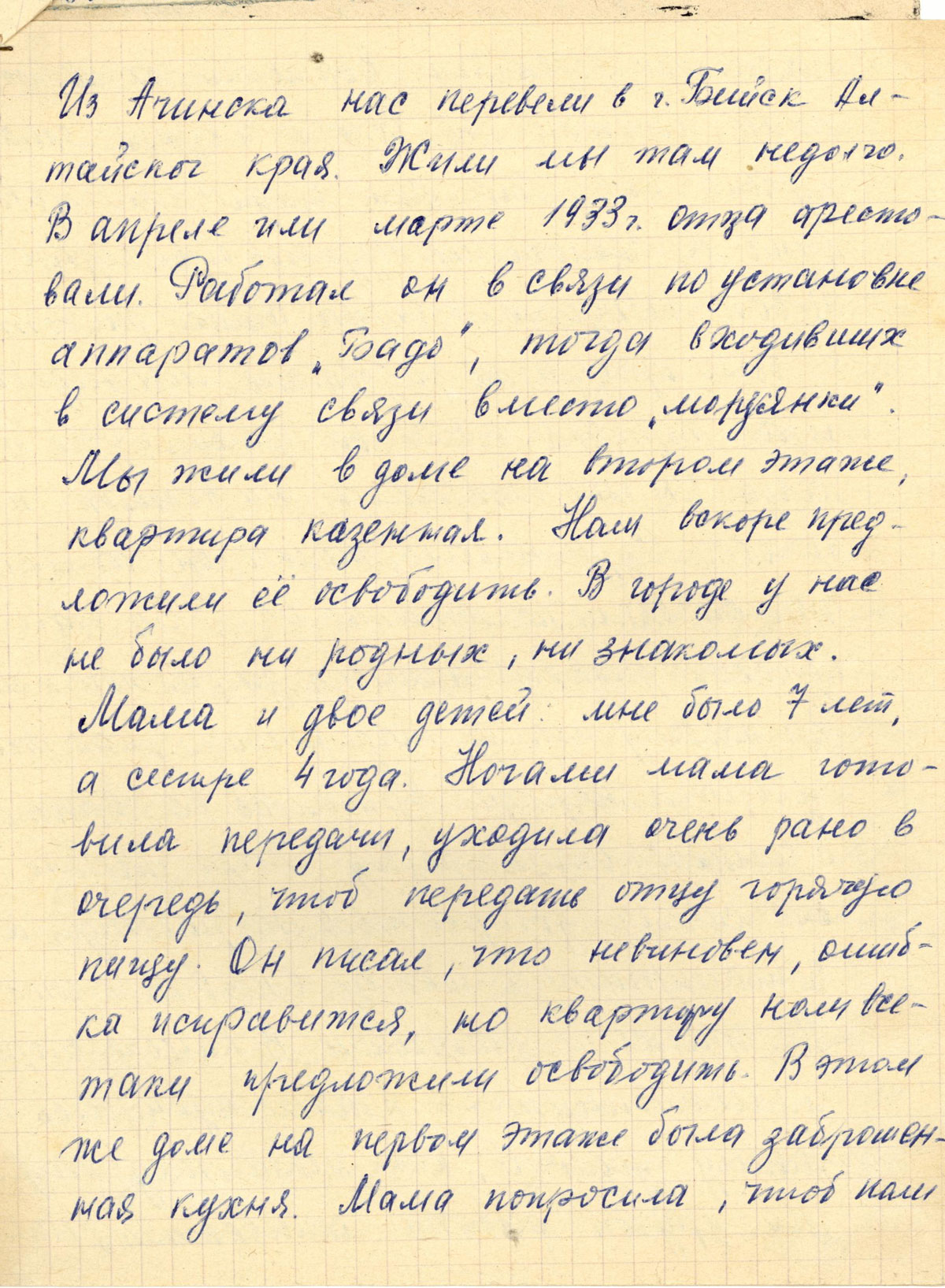 Через три дня его снова взяли и уже навсегда. Он был отправлен на Восток на 10 лет. Суда не было, только он сообщил, что его взяли по статье 58. За нами приехал дядя из Ачинска, забрал нас к себе. На работу маму нигде не брали, как жену врага народа. Пришлось ей брать согласия отца на развод. Тогда только на смогла устроиться на работу, а я поступить в школу в первый класс.