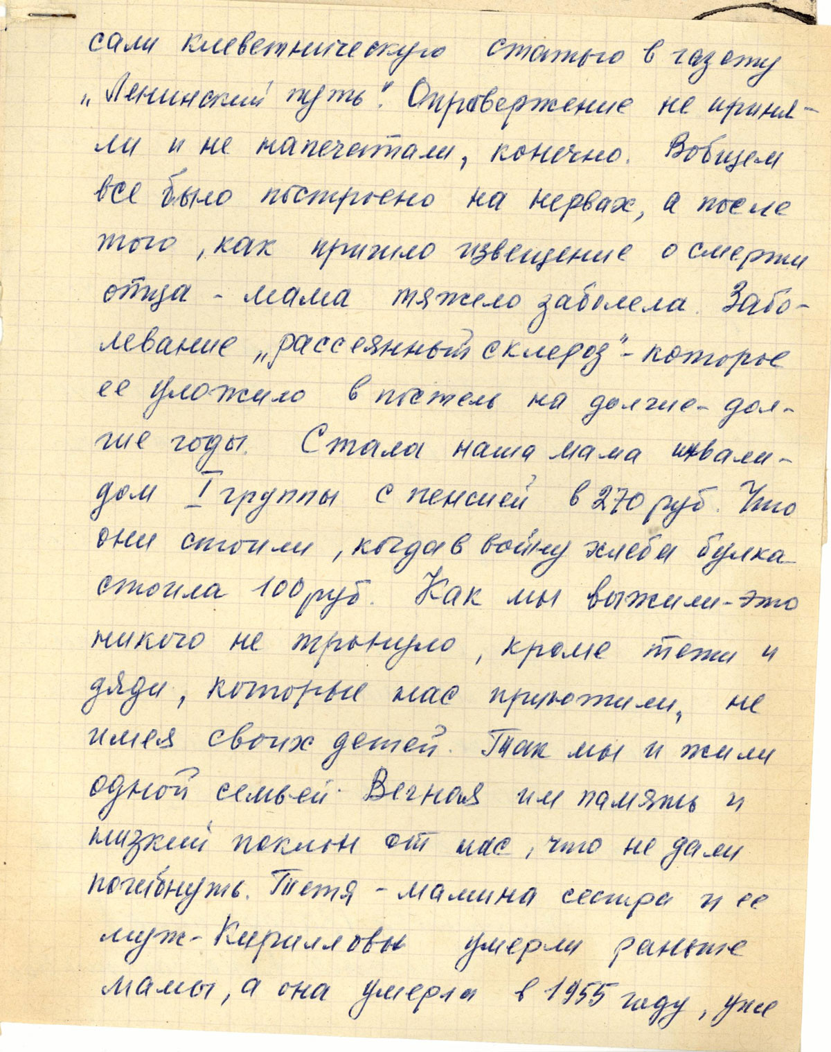 В общем все было построено на нервах, а после того, как пришло извещение о смерти отца - мама тяжело заболела. Заболевание “рассеянный склероз” - которое ее уложило в постель на долгие долгие годы. Стала наша мама инвалидом I группы с пенсией 270 руб. Что они стоили когда в войну хлеба булка стоила 100 руб. Как мы выжили - это никого не тронуло, кроме тети и дяди, которые нас приютили не имея своих детей. Так мы и жили одной семьей. Вечная им память и низкий поклон от нас, что не дали погибнуть. Тетя - мамина сестра и ее муж Кирилловы умерли раньше мамы, а она умерла в 1955 году, уже имея трех внучек. Очень трудная судьба, ужасная доля. Замуж мама не вышла, всегда говорила, что такого отца для нас и мужа для себя больше нет.