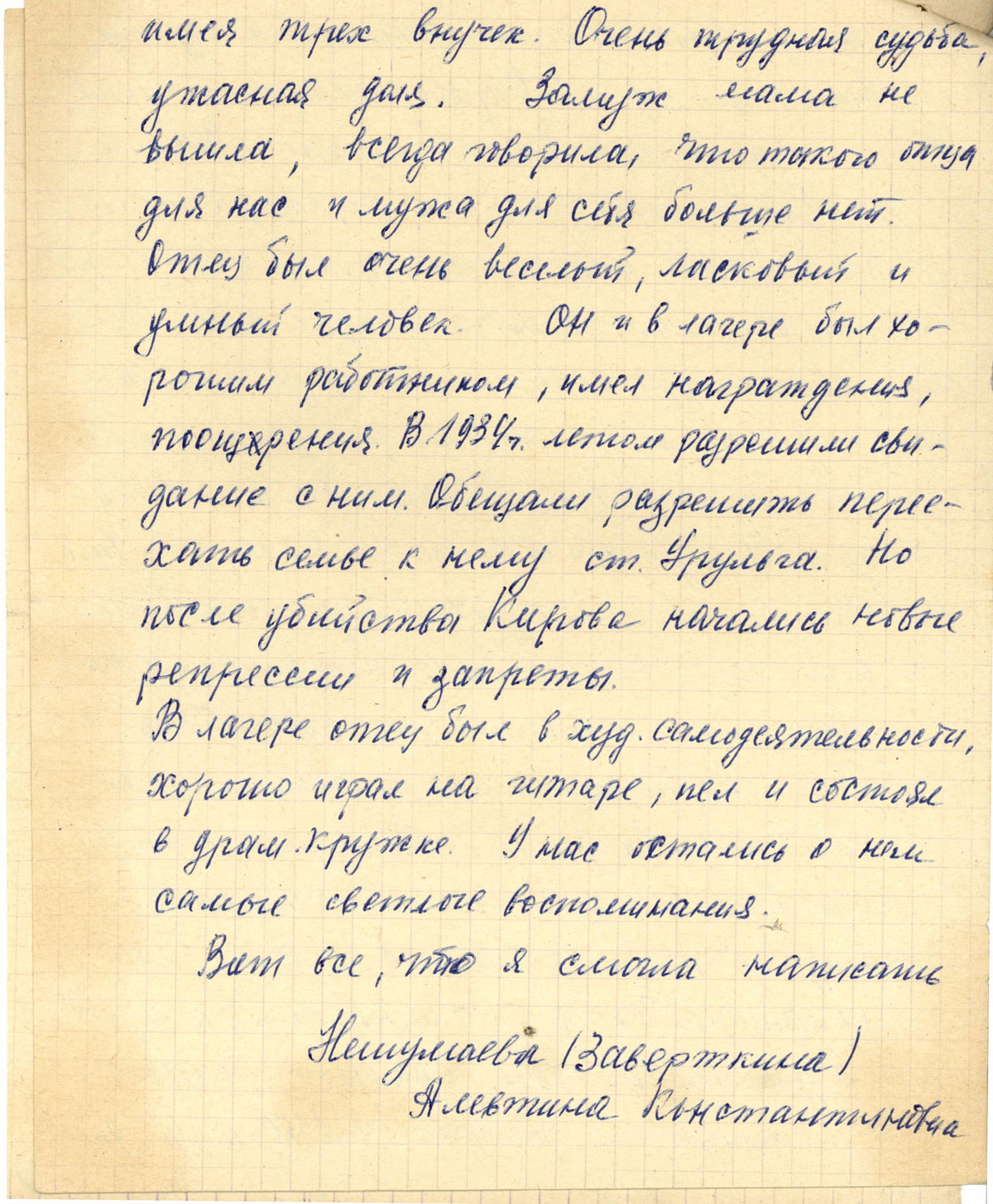 Отец был очень веселый, ласковый и умный человек. Он и в лагере был хорошим работником, имел награждения, поощрения. В 1934 г. летом разрешили свидание с ним. Обещали разрешить семье переехать к нему ст. Урульга. Но после убийства Кирова начались новые репрессии и запреты.