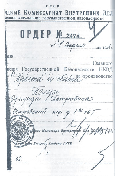 26 апреля 1938 года был арестован в самый разгар борьбы с «националами», обвинявшимися в шпионаже. Первым документом, предъявленным ему следствием, была вышеприведенная шифротелеграмма, причем в процессе допросов сумма, полученная якобы за выполнение задания, менялась, и по словам Пелузо: