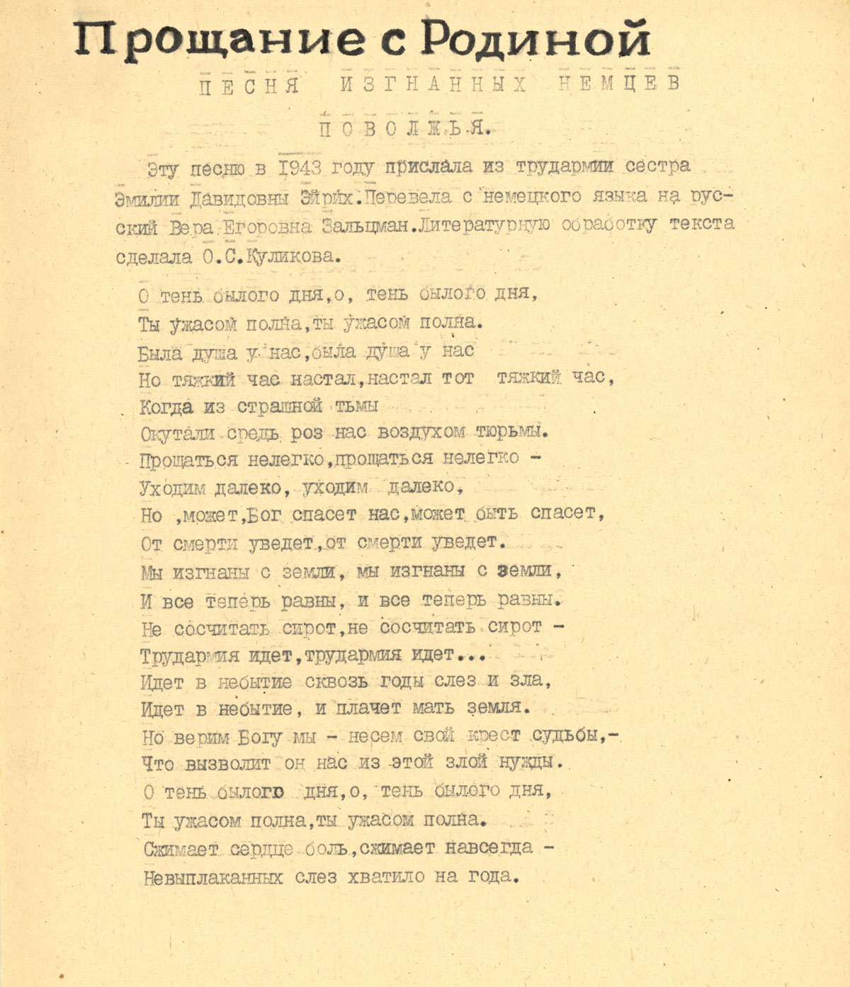 Эту песню в 1943 году прислала из тоудармии сестра Эмилии Давидовны Эйрих. Перевела с немецкого языка на русский Вера Егоровна Зальцман. Литературную обработку текста сделала О.С.Куликова.