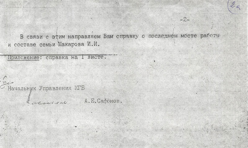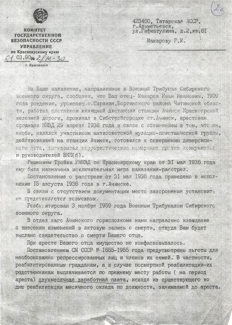 Вот, сейчас, когда прошли многие года нашего «царства-государства», никак не могу представить, кому из окружения его отца или властьимущих, в частности, сотрудников НКВД было выгодно обвинить плотника Ивана Макарова в участии в деятельности антисоветской кулацко-повстанческой группы, действовавшей на станции Ачинск-1, в подготовке к совершению диверсионного акта, высказывании террористических намерений против коммунистов и руководителей ВКП (б)? Ниже прилагаю к своему рассказу о Петре Ивановиче Макарове абсолютную копию ответа на запрос младшего брата, Геннадия Ивановича, в КГБ СССР по Красноярскому краю от 21 марта 1990 г. № 2/М-30 г. Красноярск.