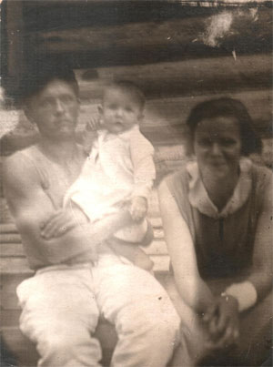 Середина 1930-х. Жилгородок ИТР Красноярского ЦБК. Техник ЦБК Петкевич Владимир Вячеславович и его супруга Ефросиния Корнеевна (ур. Чернякова) с дочерью Еленой (или с сыном Борисом – вопрос этот нужно уточнять). Часть фотоснимка (слева) почему-то оторвана. Обычно в те времена убирали изображения «врагов народа» или очень нежелательных людей.