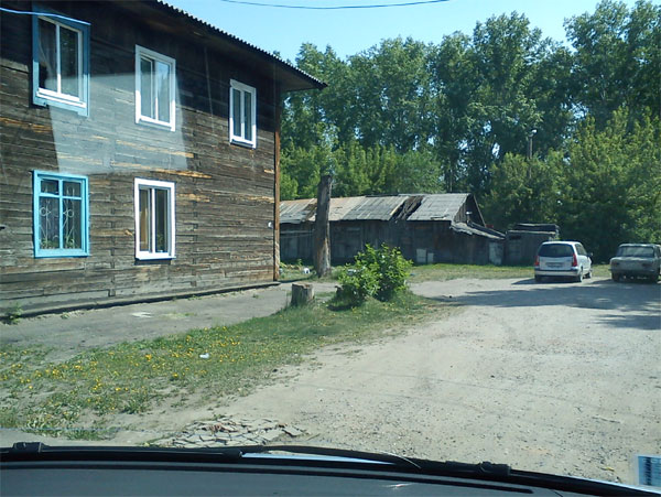А в июне 2012 года мне наконец-то повезло попасть по делам, всего на день, в Красноярск. И при любезной поддержке моих добрых знакомых меня отвезли в район ЦБК и предоставили возможность осмотреть его и жилгородок. Осталось там с десяток типовых, явно довоенной постройки деревянных домов (см. ниже на снимке). При увеличении снимка у крыльца можно разглядеть лавочку, на подобной которой сидят Владимир и Ефросиния с ребёнком ( см. следующий снимок).