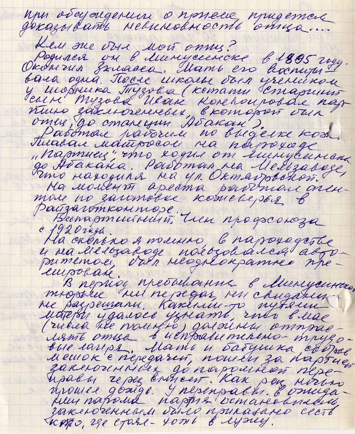 В период пребывания в Минусинской тюрьме ни передач, ни свиданий не разрешали. Какими то путями матери удалось узнать, что в мае (числа не помню) должны отпралять отца в исправительно-трудовые лагеря. Мать и бабушка, собрав мешок с передачей. Пошли за партией заключенных до паромной переправы через Енисей. Как раз ночью прошел дождь. У переправы в ожидании парома партия остановилась, заключенным было приказано сесть кто, где стоял — хоть в лужу. Только здесь издали ни удалось увидеть отца. Мать вернулась назад (нужно было на работу), бабушка пошла до ст. Абакан. Она издали видела, как их погрузили в вагоны, но передачу передать так и не смогла, т. к. и близко к вагонам не подпускали.