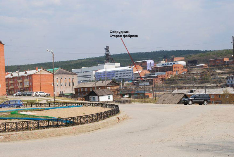 Позади видны здания золотого прииска.