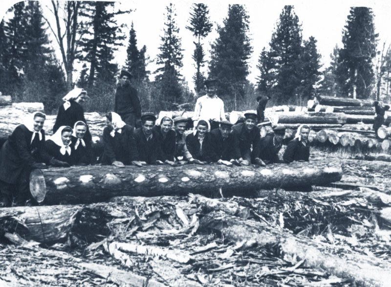 Фот.49 Группа ссыльных в лесу — на фоне строившегося барака.