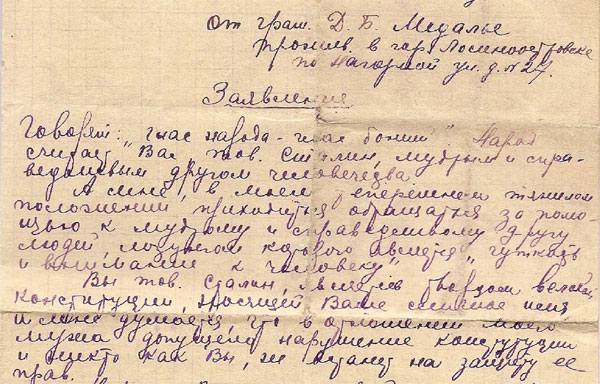 Говорят: «глас народа – глас божий». Народ считает Вас, тов. Сталин, мудрым и справедливым другом человечества. А мне, в моем теперешнем тяжелом положении приходится обращаться за помощью к мудрому и справедливому другу людей, лозунгом которого является «чуткость и внимание к человеку».
