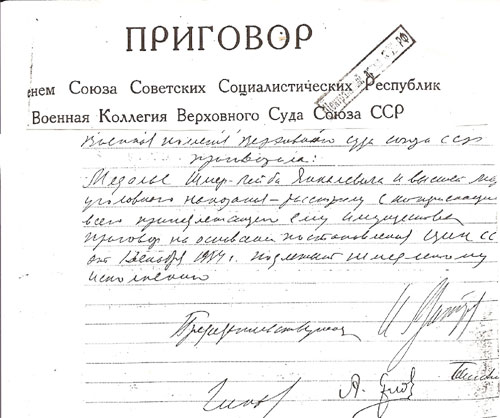 По протесту Генерального Прокурора Союза ССР Верховный Суд Союза ССР от 20 апреля 1955 г. Постановления Особого Совещания от 2 августа 1938 г. и от 15 июня 1949 г. отменил и дела на Вас прекратил и Вы полностью реабилитированы.»