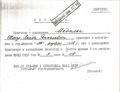 Если бы двадцать лет назад кто-нибудь сказал мне, что однажды я добровольно войду в КГБ2 , да ещё мне дадут прочитать дело моего деда с материнской стороны, главного московского раввина Шмарьягу-Иегуда-Лейба Медалье, расстрелянного в 1938 г., я бы ответил, что более вероятно встретить его живым на улицах Нью-Йорка. Но в июне 1997 г., через 23 года после нашей эмиграции мы с женой приехали в Москву именно для чтения дел. Мы оба – дети ГУЛАГа: не только дед, но и оба отца, а также несколько других родственников были репрессированы в сталинское время.
