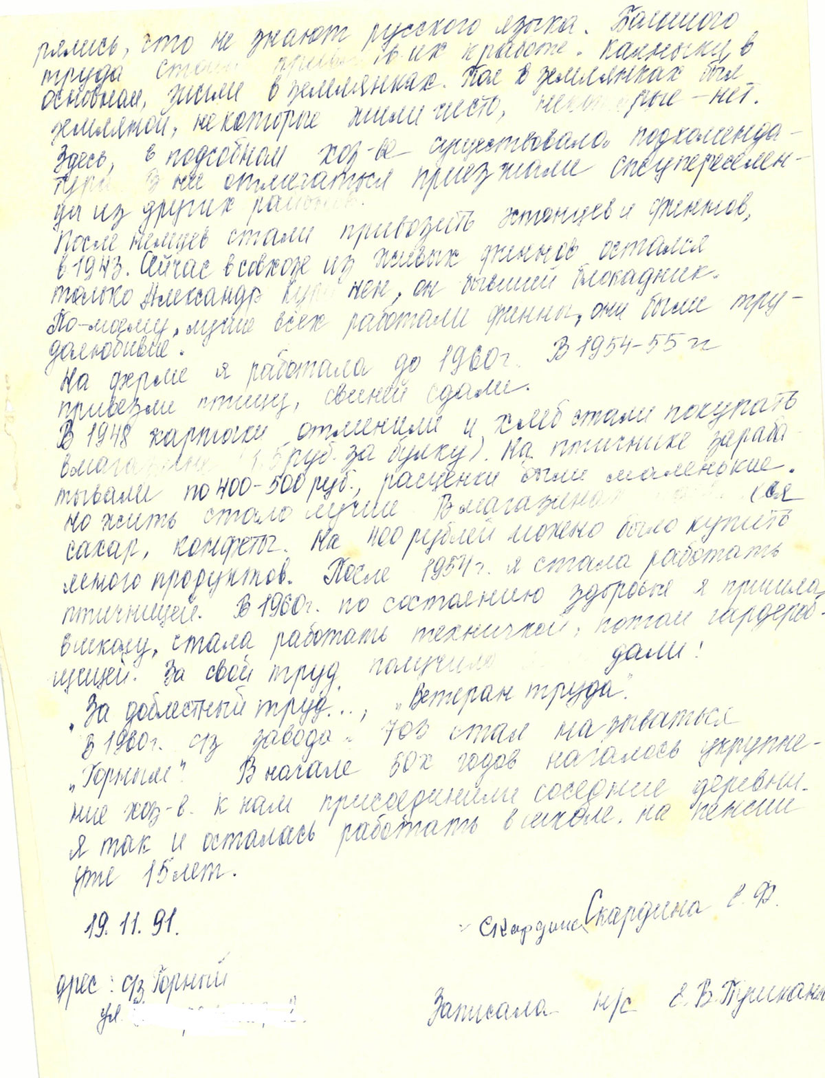 В 1960 г. с/з завода №703 стал называться “Горным”. В начале 50-ых годов началось укрупнение хозяйств, к нам присоединили соседние деревни. Я так и осталась работать в школе, на пенсии уже 15 лет.