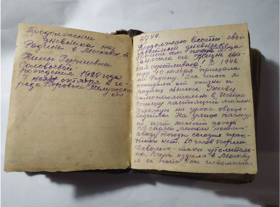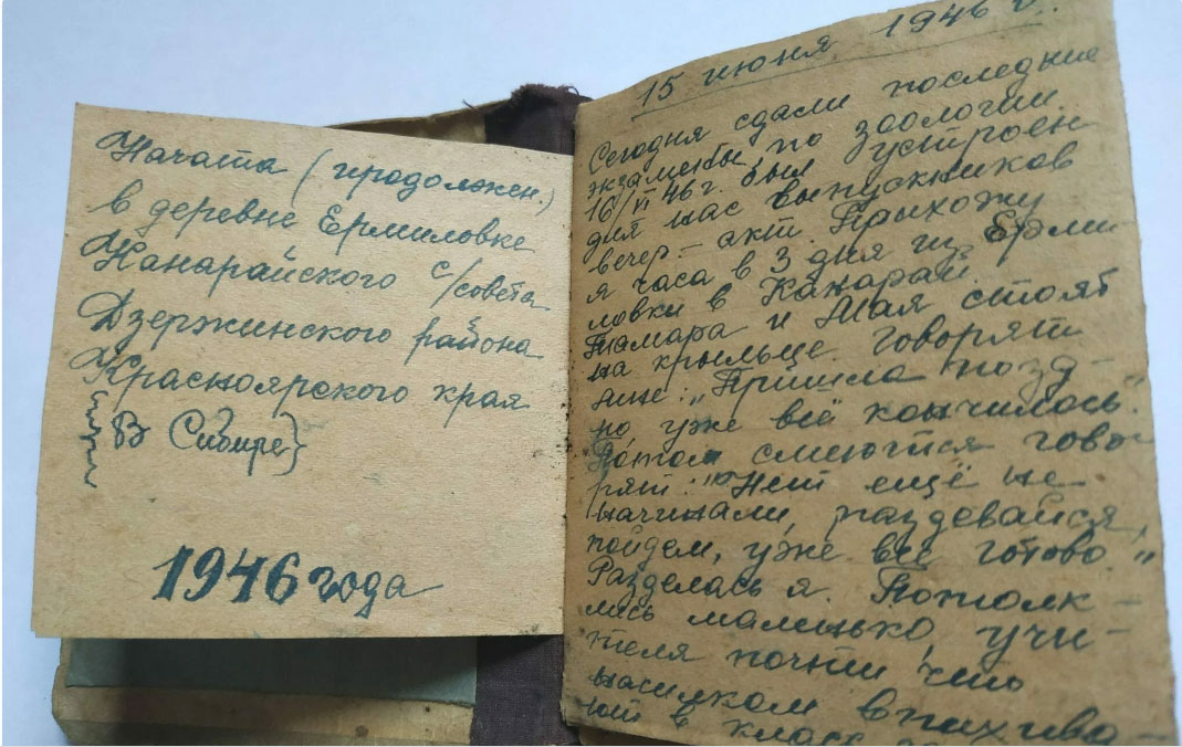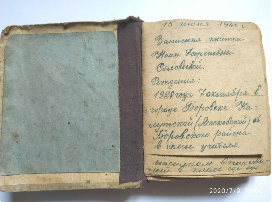 Наша коллега прожила очень драматичную судьбу. Ее отец, боровский учитель Георгий Петрович Соловьев, 25 июля 1942 года был расстрелян за сотрудничество с фашистами (в 2003 году реабилитирован), а его жену с дочерью выслали в Сибирь. Так Соловьевы оказались в деревне Ермиловке Дзержинского района Красноярского края. Там будущая журналистка и начала писать этот дневник.