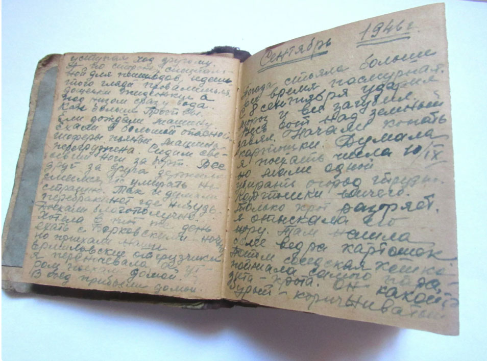 Сегодня пасмурная погода, моросит мелкий дождик. Холодно. Мама утром пошла в Дзержинск, и всё пешком топать 36 километров. Пошла с огурцами да с сырой картошкой. Хлеба нет ни крошки. Утром ходила занять муки у соседки, но разве здесь дадут! Такие люди, которые ничего не переживали, они и несознательные.