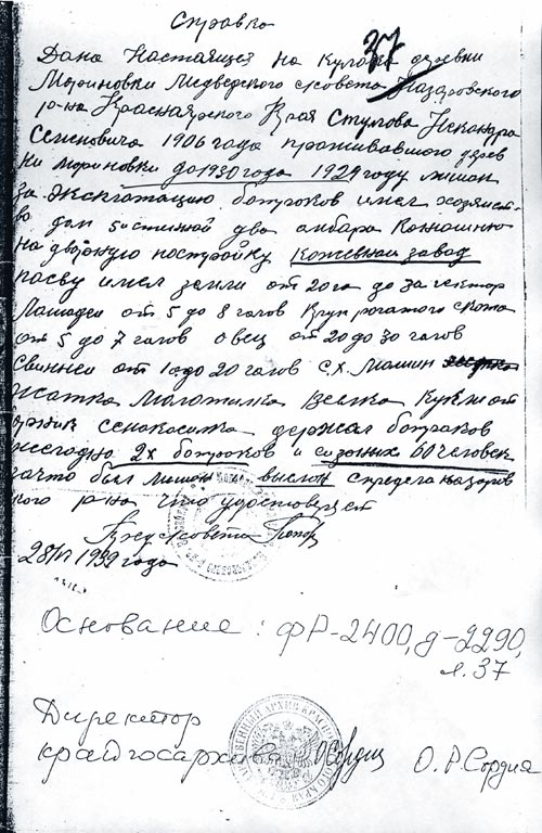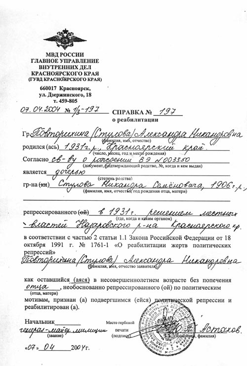 Мы уехали в Ачинск к брату мамы. Там папа пас коров по найму, где не требовалось документов, но все равно документы-то надо иметь. И в 1935 году он решил попытаться получить паспорт. А как только пришел в милицию, за паспортом обратно его уже привезли на «воронке». Мы с братом уже учились в школе. Вся учеба прервана, нас в повозку и опять в ссылку. Это происходило уже в Ачинске, потому с/справки № 197 данные в отделе администрации Назаровского р-на нет. Это надо искать в Ачинске.