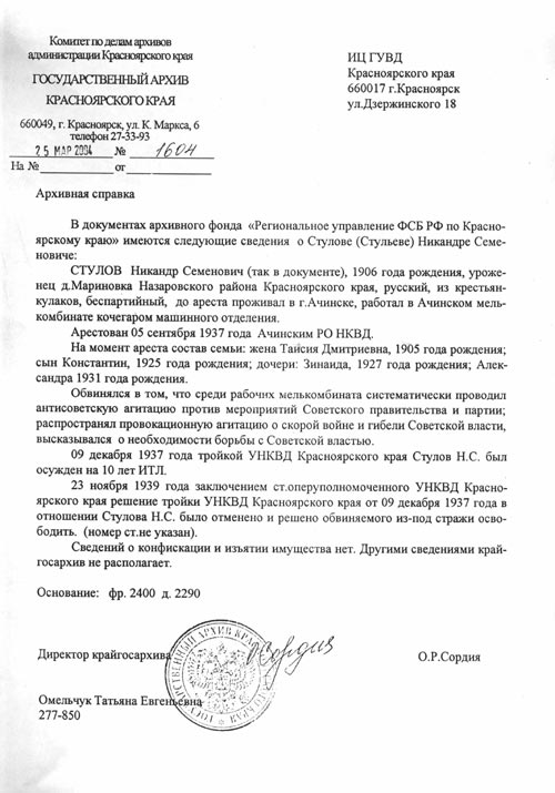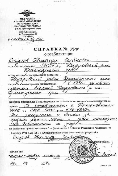 Вношу пояснения-дополнения к архивным справкам о реабилитации нашего отца Стулова Никандра Семеновича, 1906 г.р. и нас, его детей: