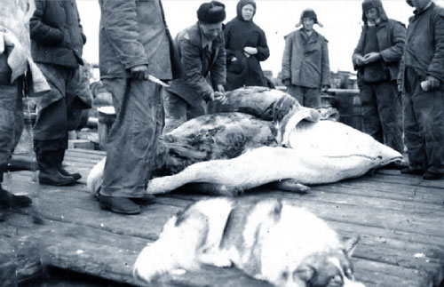 Разделывание белухи на рыболовецкой точке Варкузино. 1949-1951 гг.