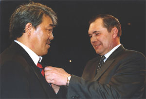 вручает Лонгину Хану орден Дружбы народов