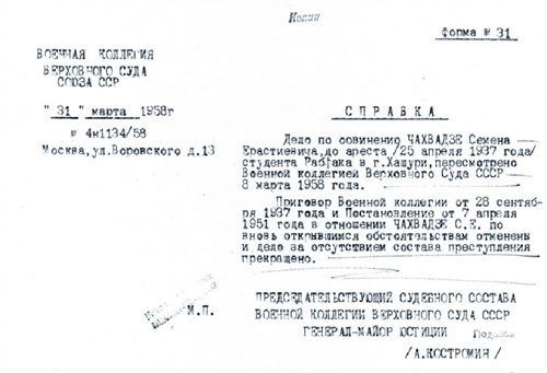 Освободился Симон Чахвадзе в 1947 году, но еще пять лет числился ссыльнопоселенцем и не имел права выезда за пределы Дудинки. Здесь он познакомился со своей будущей женой Таисией Митрофановной Друговой, бывшей заключенной, осужденной по 58-й статье. Полностью С. Э.Чахвадзе был реабилитирован в 1958 году, спустя двадцать один год после ареста. Он умер в Дудинке в 1993 году