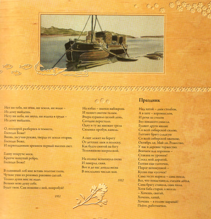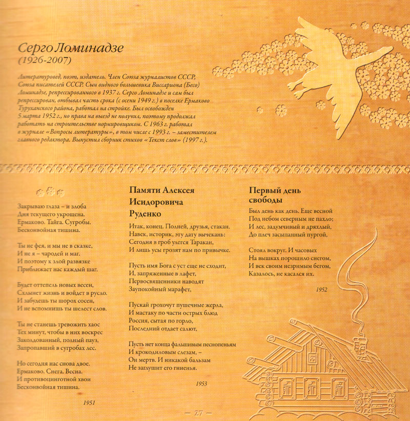 Ариадна Эфрон(1912-1975) Переводчица прозы и поэзии, мемуарист, художник, искусствовед, дочь Марины Цветаевой и Сергея Эфрона. С1921 по 1937'гг. жила с родителями в Чехии и Франции. Закончила в Париже училище прикладного искусства (оформление книг, гравюра, литография) и училище при Луврском музее (история изобразительного искусства). Вернулась в СССР в 1937г. В 1939 г. была арестована, осуждена по статье 58-6на 8лет исправительно-трудовых лагерей. После освобождения в 1947 г. вновь была арестована и приговорена как ранее осужденная к пожизненной ссылке в Туруханск, где работала вначале уборщицей в школе, а затем художником районного Дома культуры. В 1955 г. освобождена и реабилитирована за отсутствием состава преступления. Вернувшись в Москву, Ариадна Эфрон готовила к изданию произведения матери, сама занималась стихотворными переводами. Написанные ею 17 стихотворений могут быть отнесены к периоду ее туруханской ссылки. |