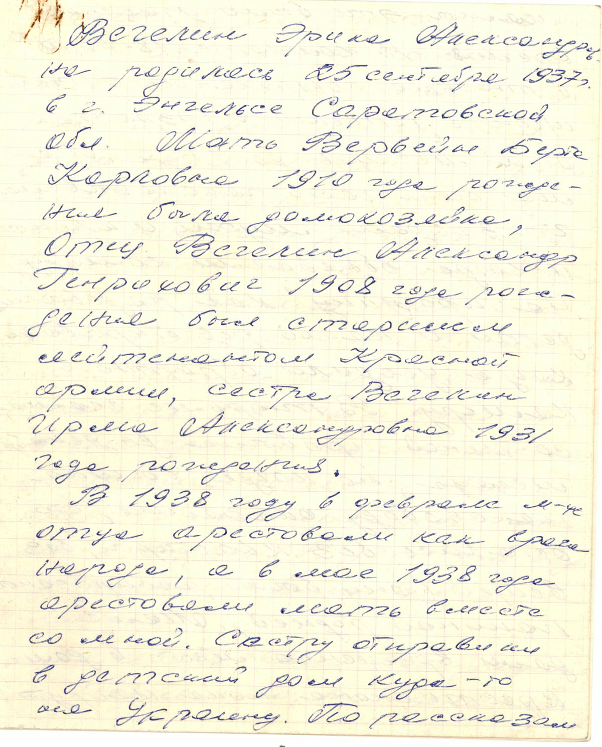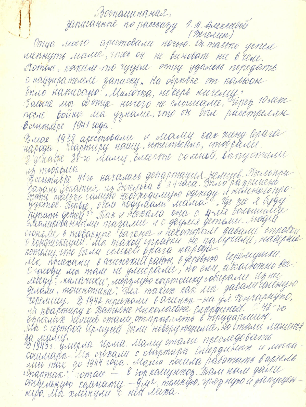 В 1938 году в феврале месяце отца арестовали как врага народа, а в мае 1938 года арестовали мать вместе со мной. Сестру отправили в детский дом куда-то на Украину. По рассказам мамы это было ужасное время. В комнате 18-20 м2 в тюрьме содержалось 30 женщин с детьми в возрасте от 2-х месяцев до 1 года. Мама очень часто рассказывала, что заедали муки и клопы, и когда объявляли команду “на прогулку” как радовались дети и какой рев открывали когда уводили обратно в камеру. В тюрьме мама пробыла со мной до декабря месяца, но когда вышла на свободу оказалось, что остались без квартиры, без вещей (они были распроданы папиной родней). Маме дали временно место в доме крестьянина пока найдут жилье. В дом крестьянина же была из детдома привезена сестра. После долгих хождений по инстанциям нам дали комнату (отгородили часть коридора), в которой мы прожили до эвакуации. Родственники боялись общения с мамой, т.к. Это преследовалось властями. Мама устроилась на работу, но так как я очень часто и сильно болела (тюрьма оставила свой след), то материально жили очень трудно. В детский сад устроить мама меня не могла.
