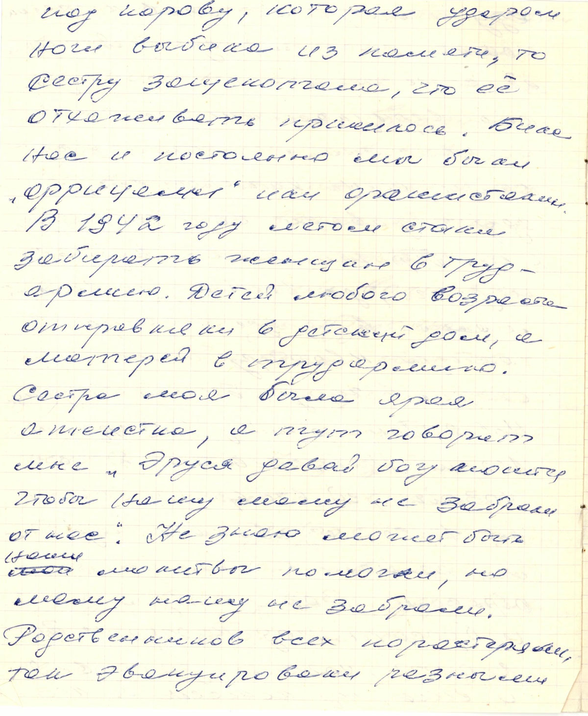 В 1942 году летом стали забирать женщин в трудармию. Детей любого возраста отправляли в детский дом, а матерей в трудармию. Сестра моя была ярая атеистка, а тут говорит мне: “Эруся, давай богу молить, чтобы нашу маму не забрали от нас.“ Не знаю, может быть наши молитвы помогли, но маму нашу не забрали.