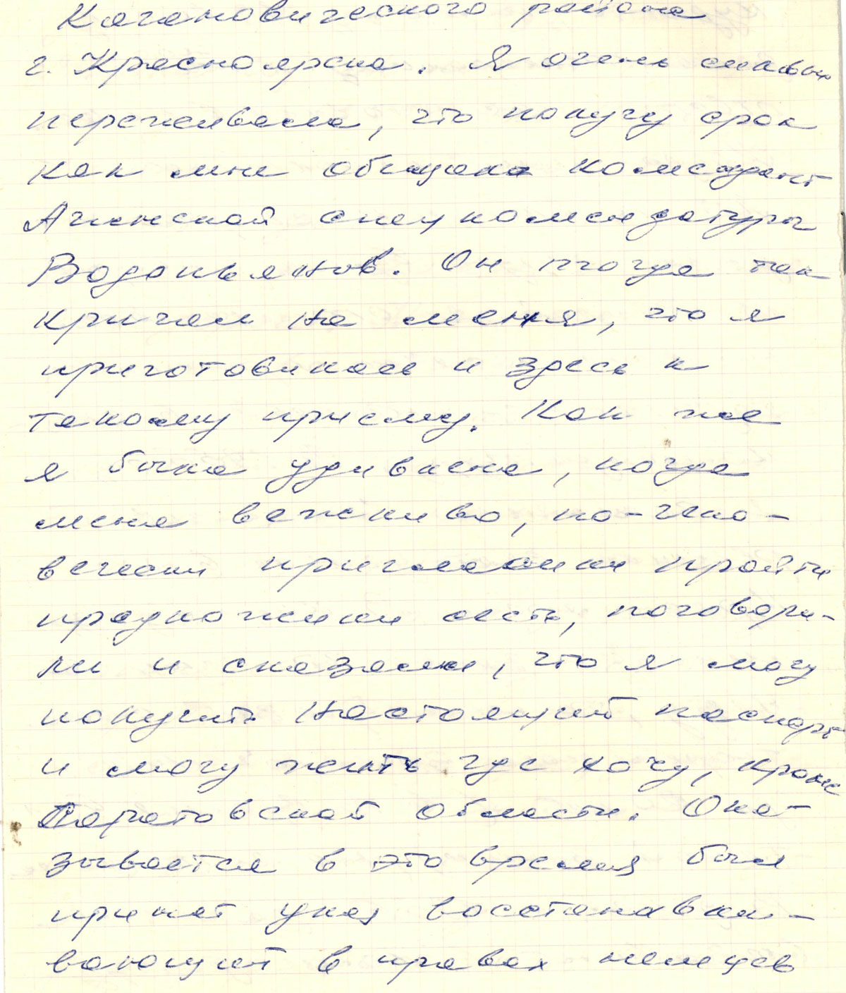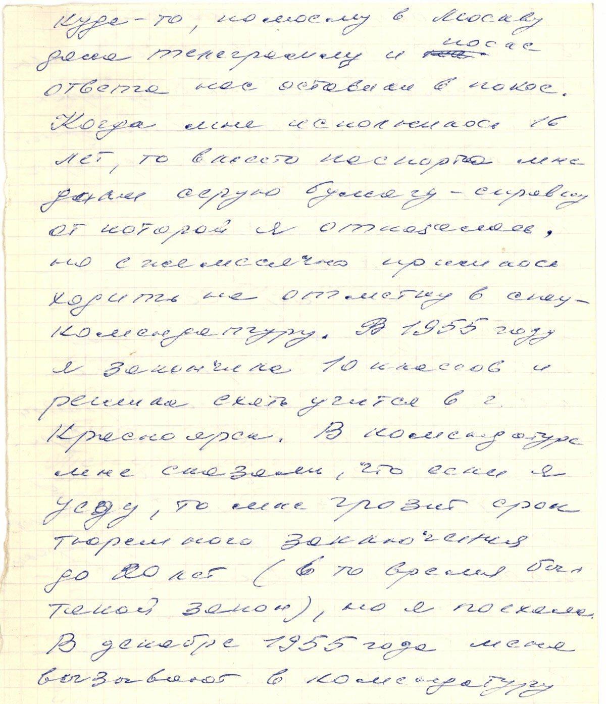 В 1955 я закончила школу и хотела поехать учиться в Красноярск. Комендант не отпускал меня, ведьмы должны были ежемесячно отмечаться. Мне выдали “волчий билет” - справку рыжего цвета. Я от нее отказалась и уехала самовольно. Комендант пригрозил посадить на 20 лет. На отметку в комендатуре люди боялись опоздать. За это наказывали вплоть до ареста.
