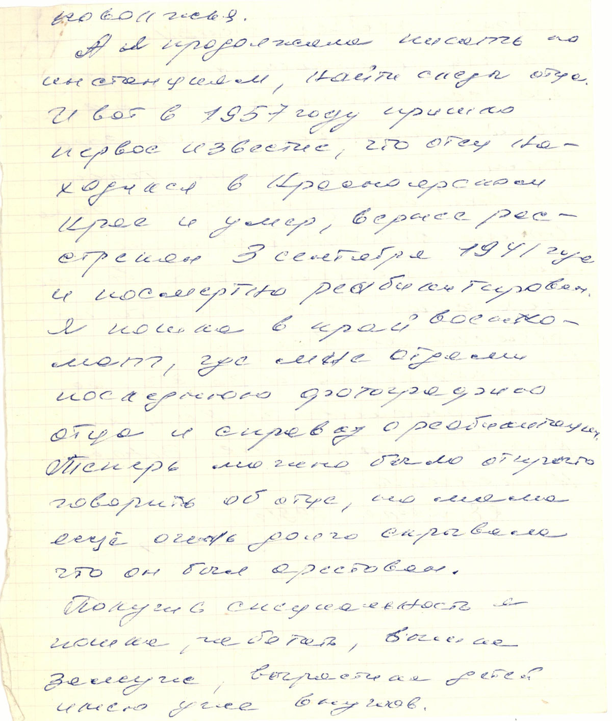 И вот в 1957 году пришло первое известие, что отец находился В Красноярском крае и умер, вернее расстрелян 3 сентября 1941 года и посмертно реабилитирован.